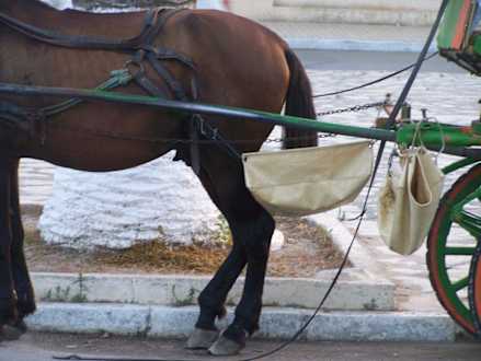 Jazda bryczkąPrzy wyjściu z hotelu Les Pyramides powala nas niesamowity smród końskich odchodów. Kał jest zbierany do podwieszanych worków i wyrzucany do kontenera przy hotelu, natomiast koński mocz paruje wprost z ulicy. W promieniu około 100 m od przyhotelowego parkingu dla bryczek unosi sie niesamowity fetor. Raz, w ciągu dwóch tygodni widziałem ulicę zlaną przez polewaczkę wodą, ale było to w centrum miasta, w odległości około 1 km od hotelu. Pod hotelem nikt nie dba o czyste powietrze.