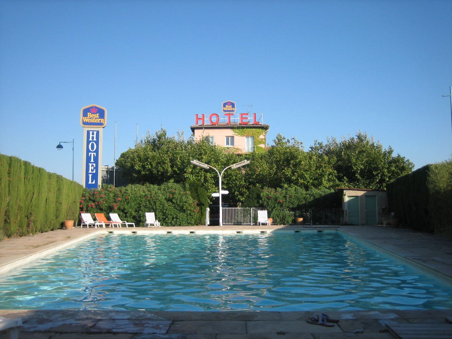 Blick vom Pool auf das Hotel, links die Straße