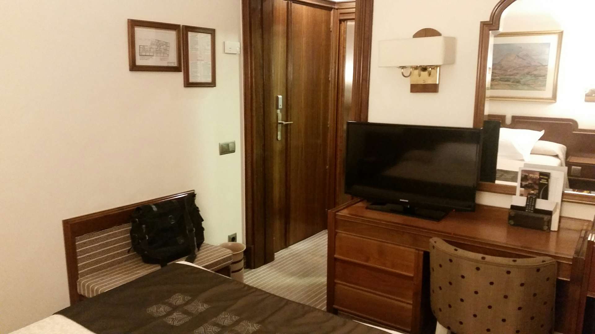 Einzelzimmer, Blick vom Bett Richtung Fernseher und Zimmertür.
