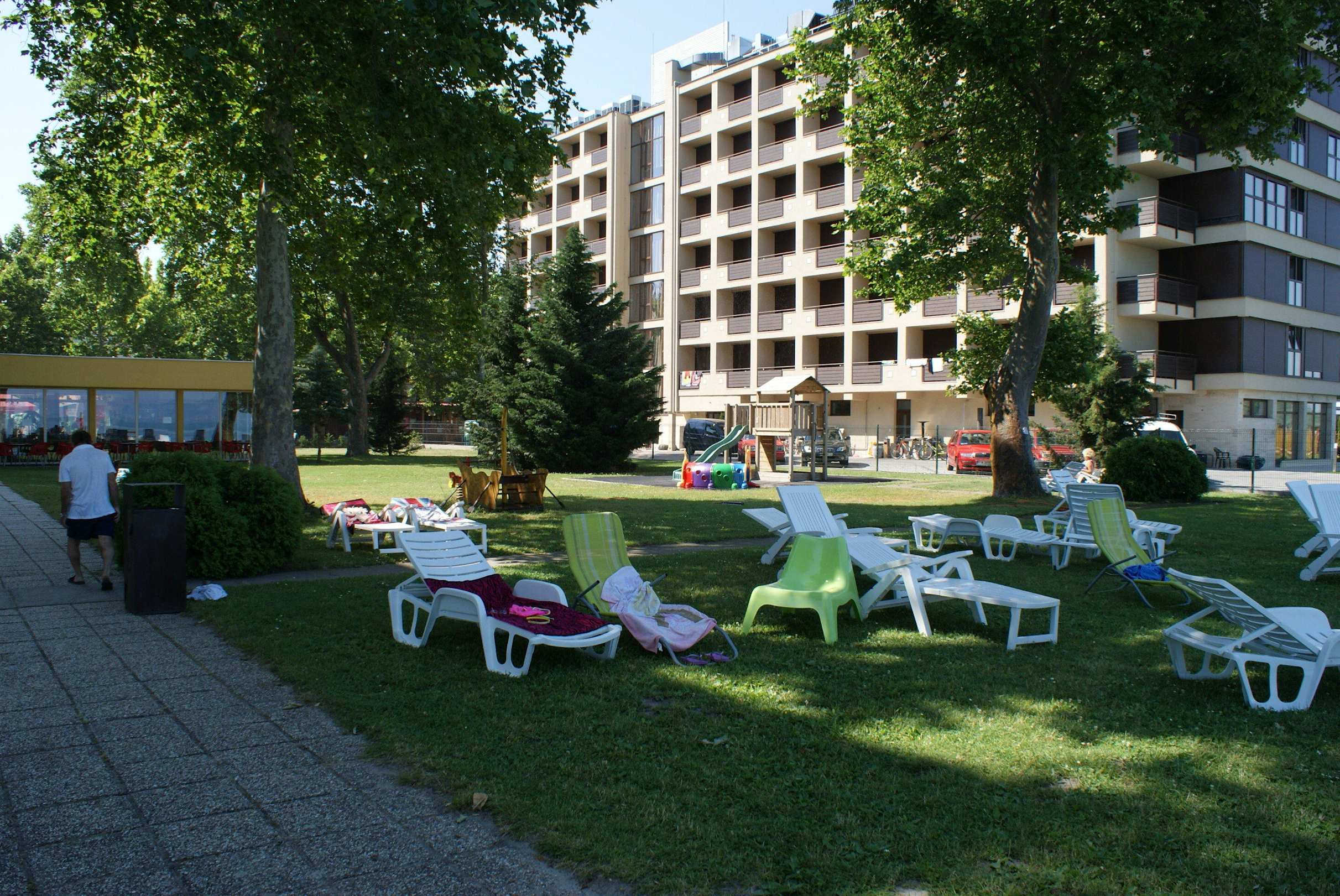Gartenanlage StrandbereichLinks der Flachbau ist die Hotellobby. Das Hotel rechts ist das Nachbarhotel "Hotel Balaton"