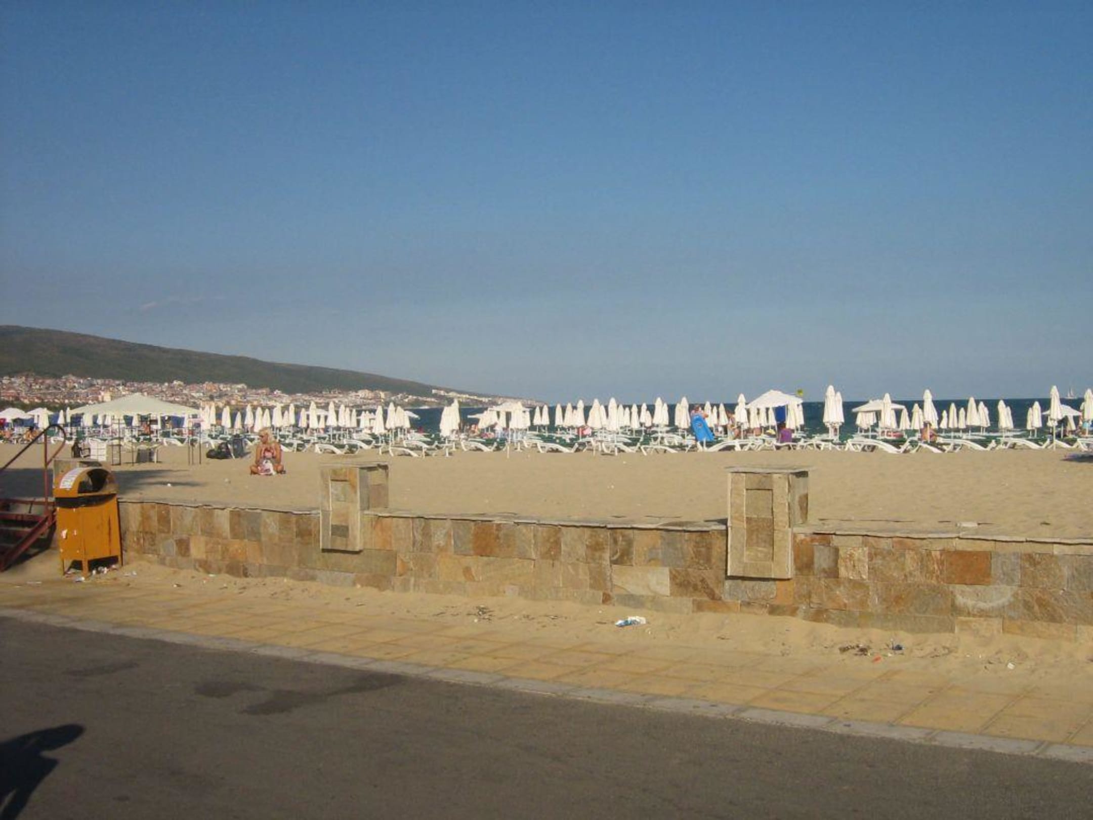 Abendstimmung am Sonnenstrand.Die Gäste sind im Hotel und die Schirme zugeklappt.