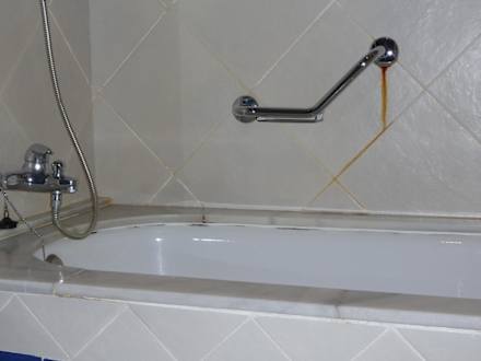 Bad, Zimmer 575Das Bad an und für sich ist OK, aber die im Bild deutlich sichtbaren Flecken trüben doch m. E. ganz erheblich den Gesamteindruck. Vielleicht wird am falschen Ende gespart, von der GMV- Geschäftsleitung abstoßende Eindrücke gerne in Kauf genommen?