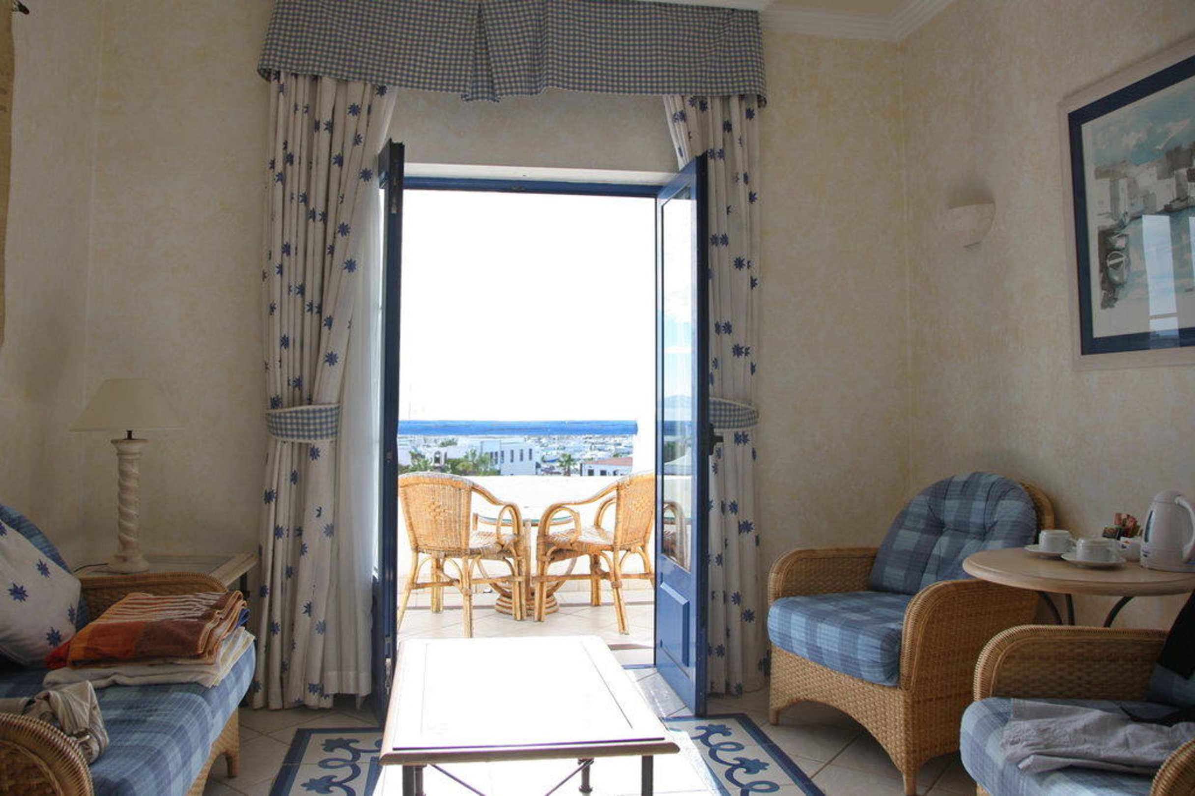 Blick durch die Balkontüre auf das Meer