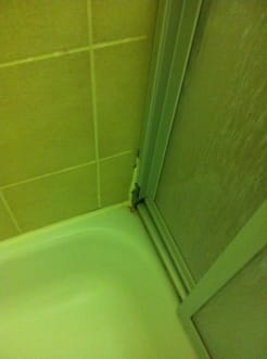 Die Dusche war sehr verkalkt, in den Ecken verschimmelt und ide Türen der Dusche waren nicht mehr in der Führung, das Wasser lief beim Duschen in das Badezimmer