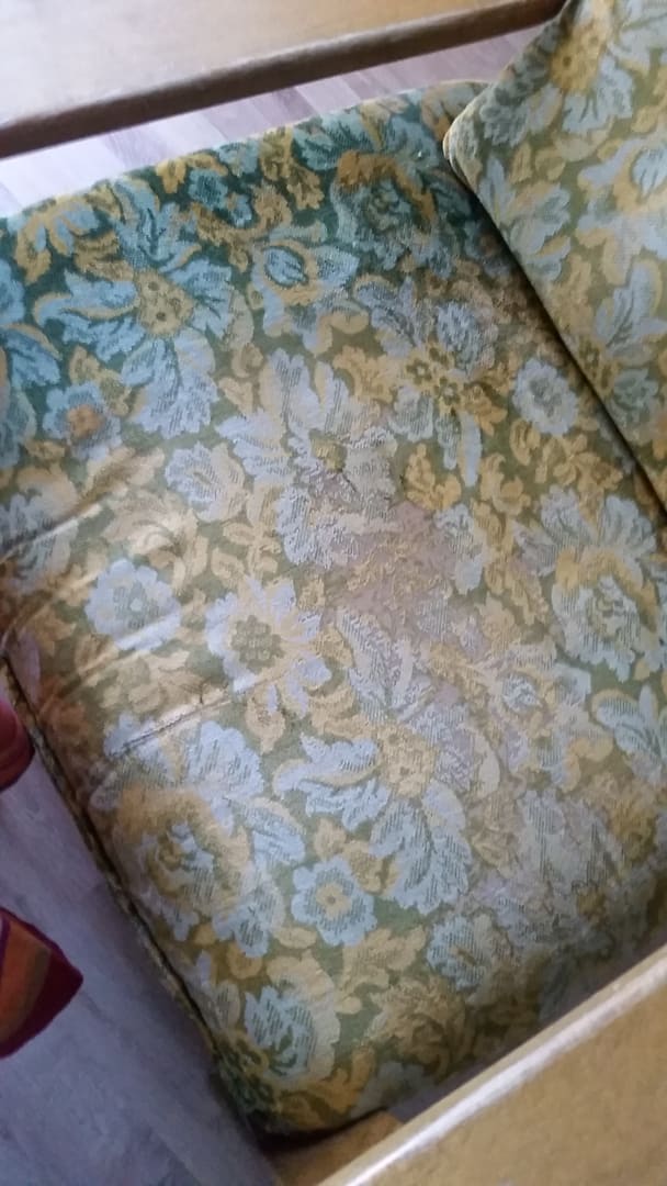Polster des Sessels einfach abgescheuert, durchgesessen; Stuhl ansonsten gut, rustikales Holz; kostet es sooo viel, den neu zu beziehen und evtl. aufpolstern zu lassen? Das lokale Handwerk würde sich sicher über Aufträge freuen...