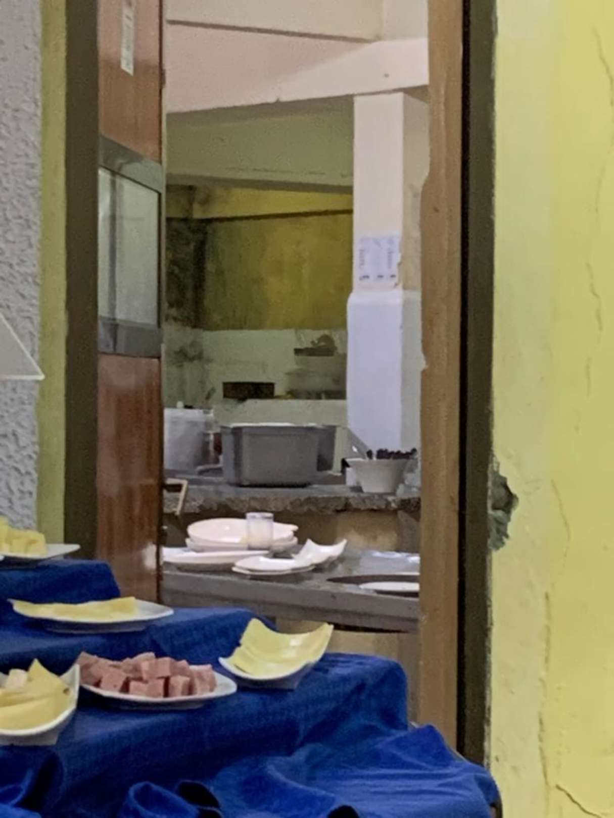 Blick vom Speisesaal auf Schimmel in der Küche