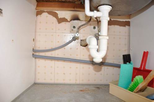 KücheMuffiger Spülenunterschrank mit viel Rost und Gestank! - Das Unterbrett war verfault, da wurde dann einfach eine Metallplatte drauf geschraubt.