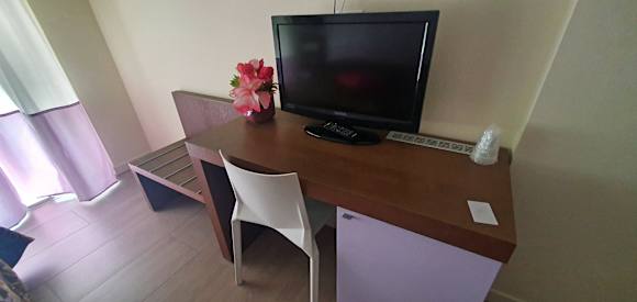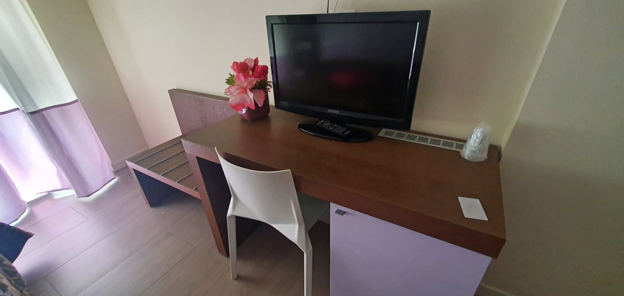 TV mit Arbeitstisch und Kühlschrank