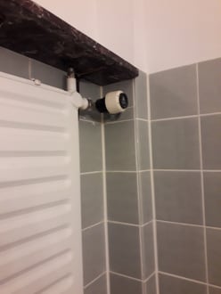 Bad wirkt durch die dunklen Fliesen sehr dunkel.