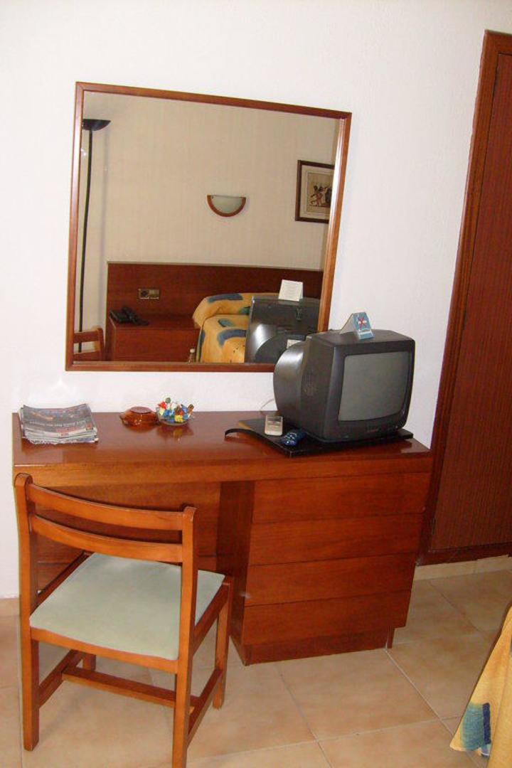 Schreibtisch mit TV und Stuhl