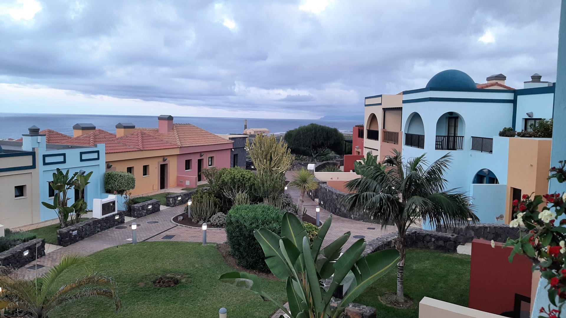 Blick vom Balkon auf die gepflegte Hotelanlage