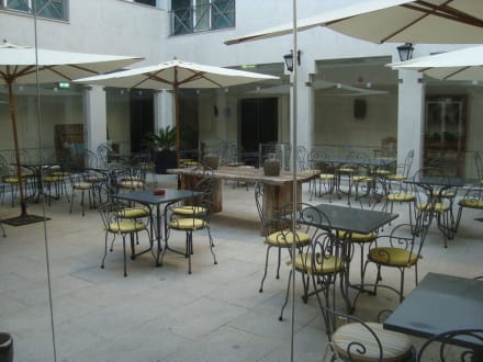 Überdachter Innenhof mit Tischen und Stühlen Hotel M'Ar de Ar Muralhas