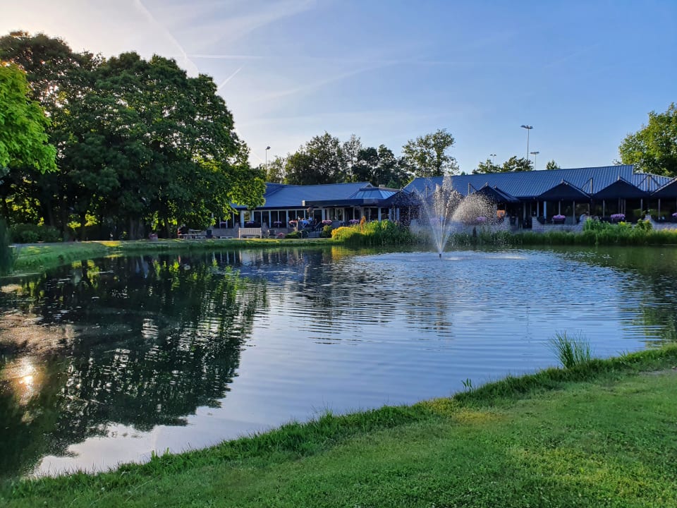Blick von den Fischteichen auf das Hotel