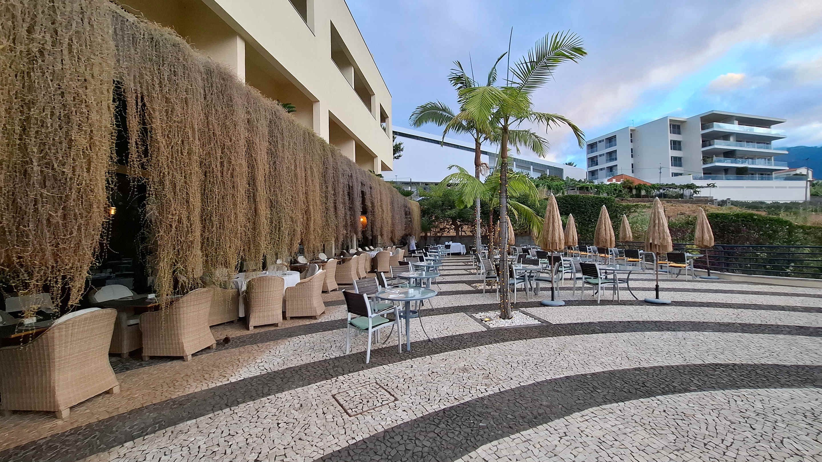 Das sind die Außensitzplätze vom Buffet-Restaurant.