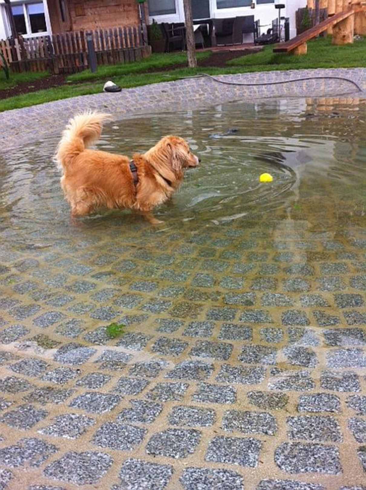 Hund im Wasser auf dem Gelände im neuen Hundespielplatz