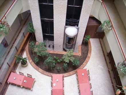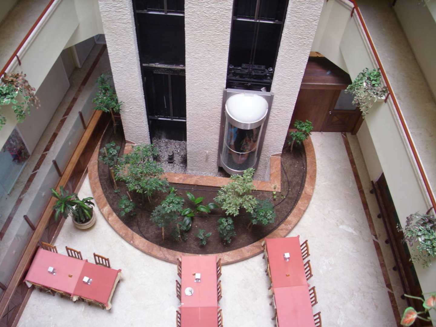 Innenhof mit Zugängen zu den Zimmern und Lift