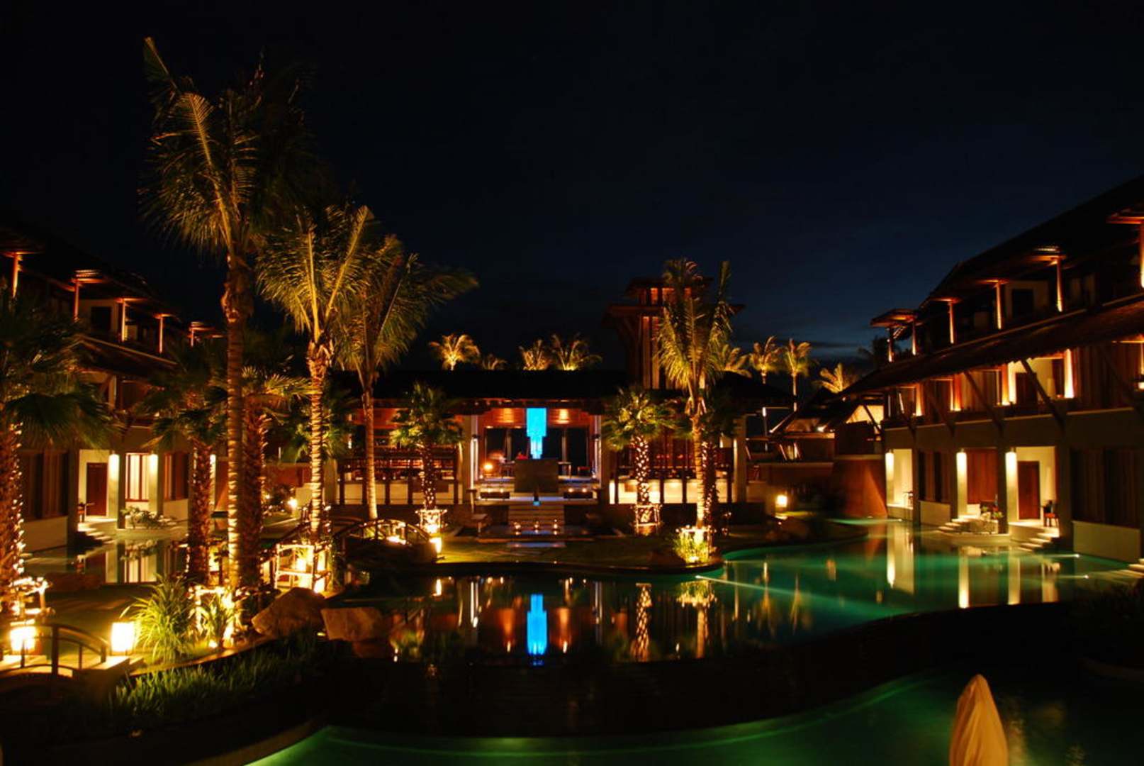 Pool bei Nacht mit Blick auf das Restaurant