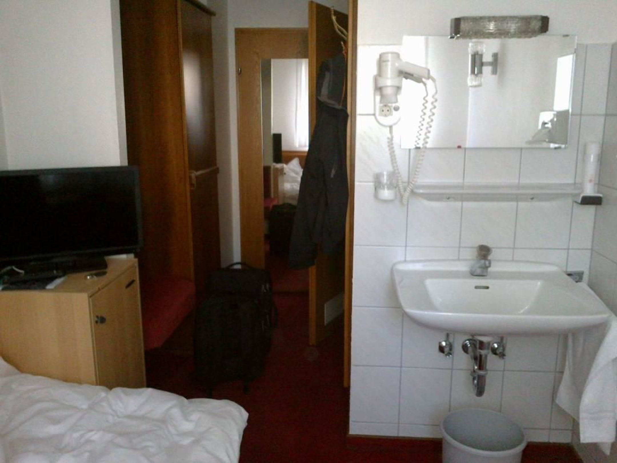 EinzelzimmerBlick vom Fenster zur Türe. Hinter dem Waschbecken ist das Mini-Bad. Links unter dem TV der Kühlschrank.