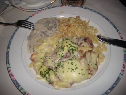 Abendessen im Restaurant. Bild 2. Schmeckte klasse. Augsburger Filettöpfchen mit Schweinefilet an Schwammerlsoße, Salat, hausgemachten Spätzle und mit Käse überbacken.