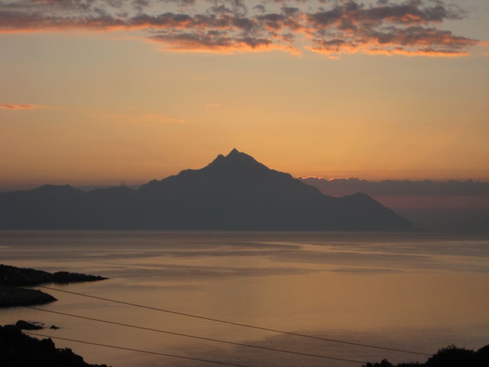 AusblickDer Sonnenaufgang über dem Berg Athos ist immer wieder ein tolles Naturschauspiel. Man sieht ihn im Maistrali vom Balkon aus.