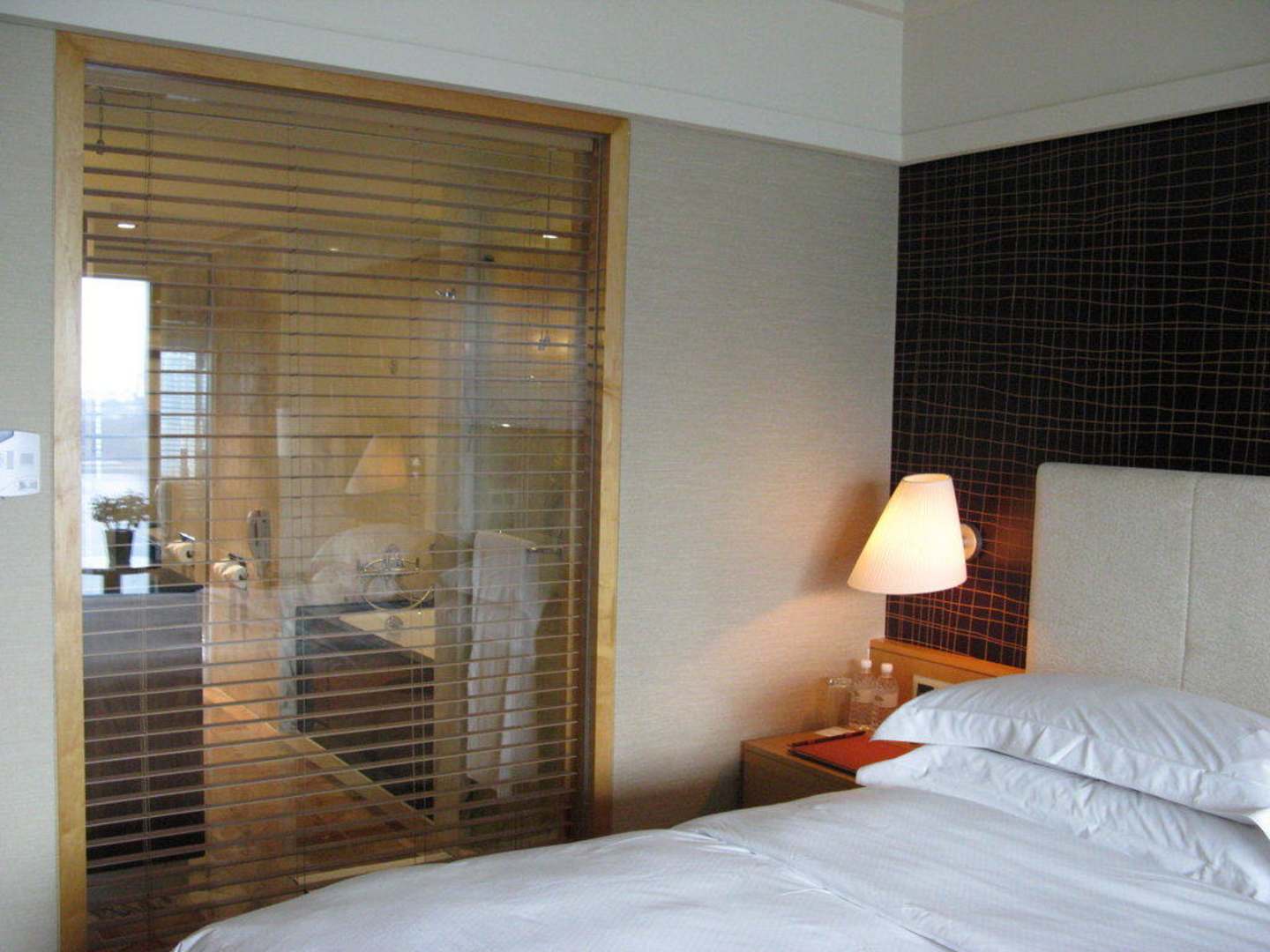 Blick durch die Jalousie zum Bad