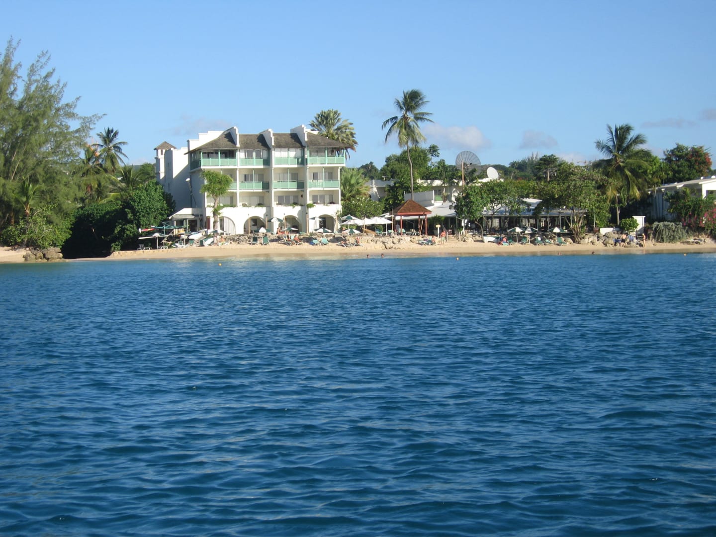 Das Hotel Das Hotel mit Strand vom Wasser aus, rechts der Restaurantbereich - beim Essen den Blick auf die Karibik - traumhaft