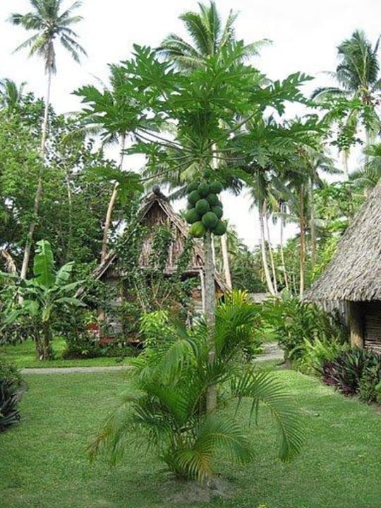 Papaya-Baum mit den Einzelbungalows im Hintergrund.