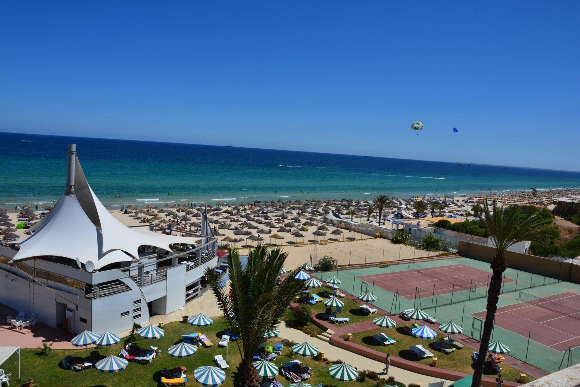Widok na plażę i kort tenisowy.