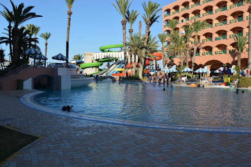 Pool mit Rutschbahnen im Hintergrund