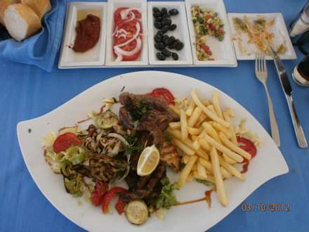 Dieser Grillteller kostet 20 Dinar. Er ist reichlich, doch essen kann man nicht alles. Dahinter Oliven und Salate, die 15 Minuten früher hingestellt wurden bei ca. 30 Grad. Eßbar ist es dnan nicht mehr.