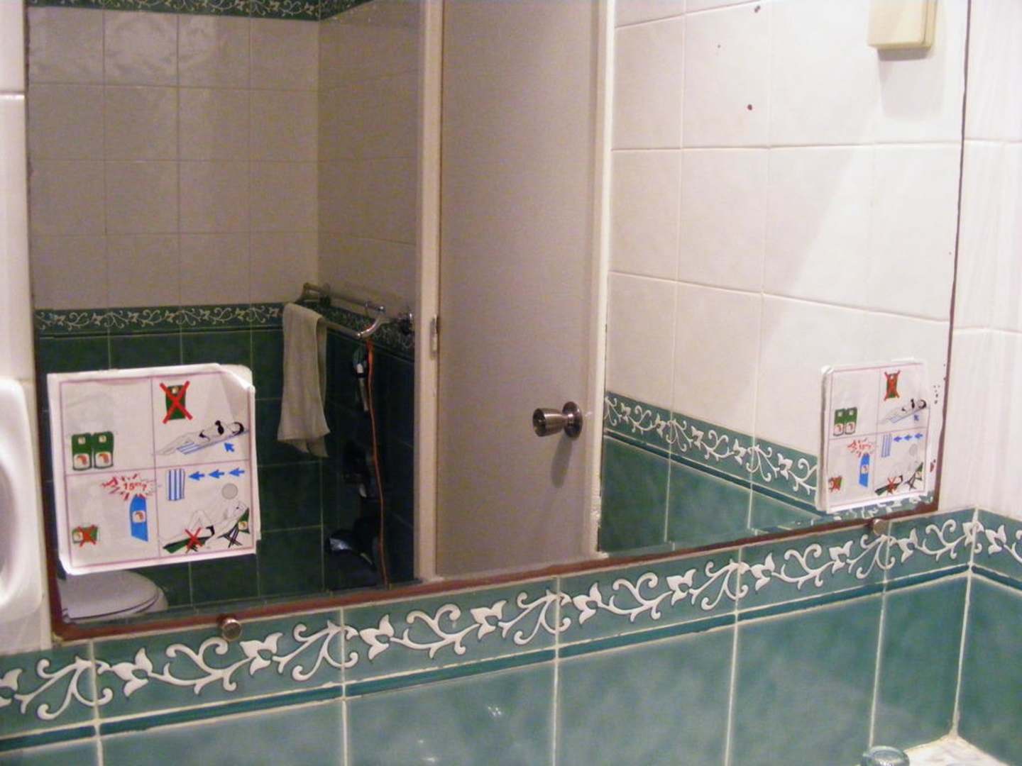 alter mit Verbotsschildern beklebter Badezimmerspiegel