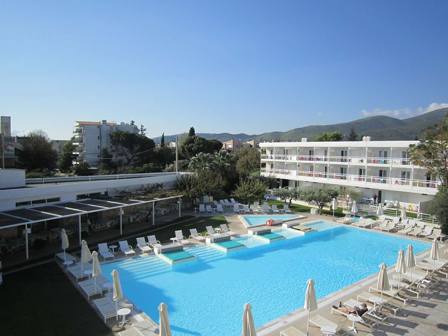 GartenanlageBlick auf einen der Zimmerflügel (in dem wir wohnten) und das Frühstücksrestaurant sowie den Pool mit Liegen und Sunbeds
