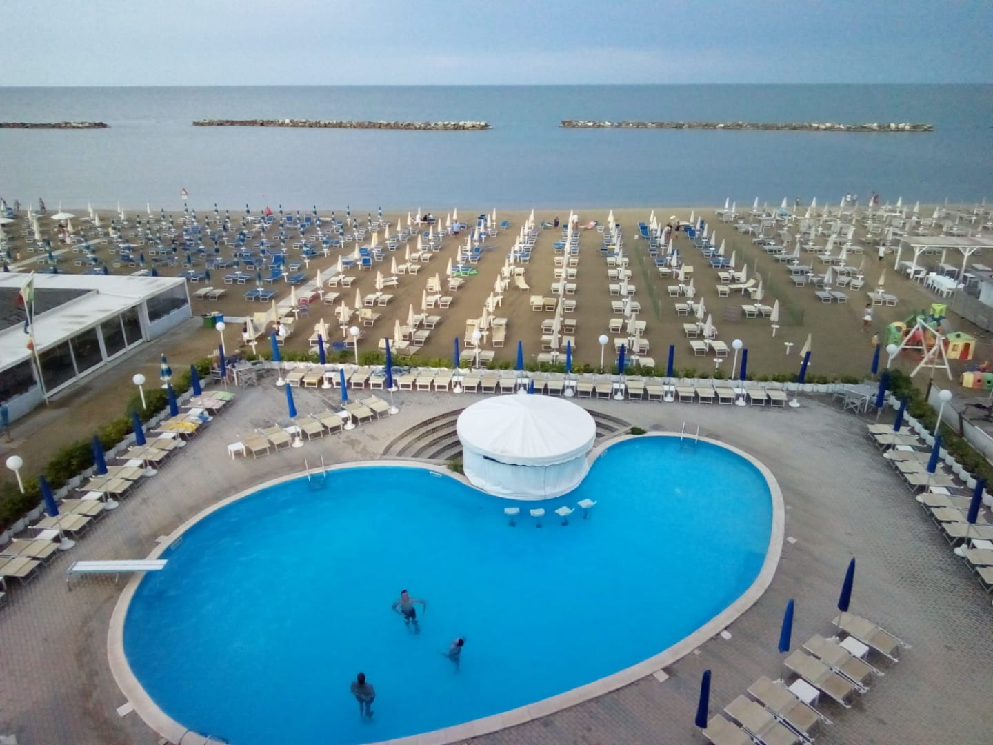 Blick vom 3. Stock auf Pool und angrenzendes Strandbad "Bagno Azzuro"