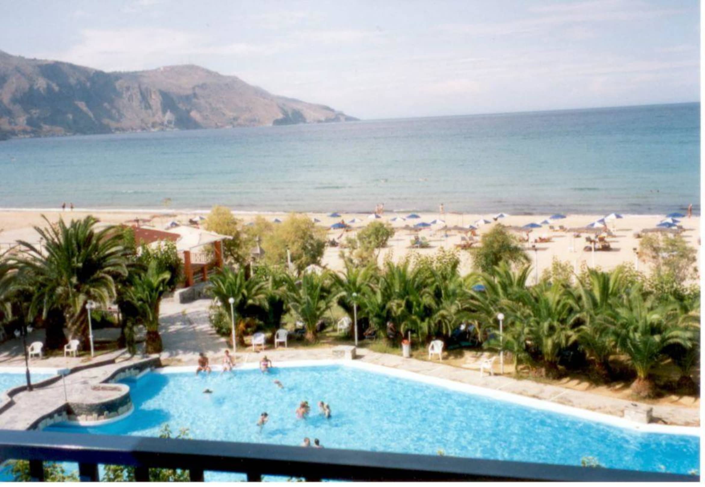 Man sieht auch den Pool des Hotels und die Beachbar.