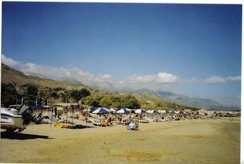 breiter Hotelstrand, im Hintergrund die weißen Berge