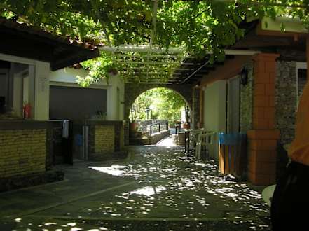 Hier ein Blick inmitten der Poolbar zur Strassenseite. Der wilde Wein spendet zu jeder Zeit reichlich Schatten, um den Kaffee o.a. geniessen zu können.