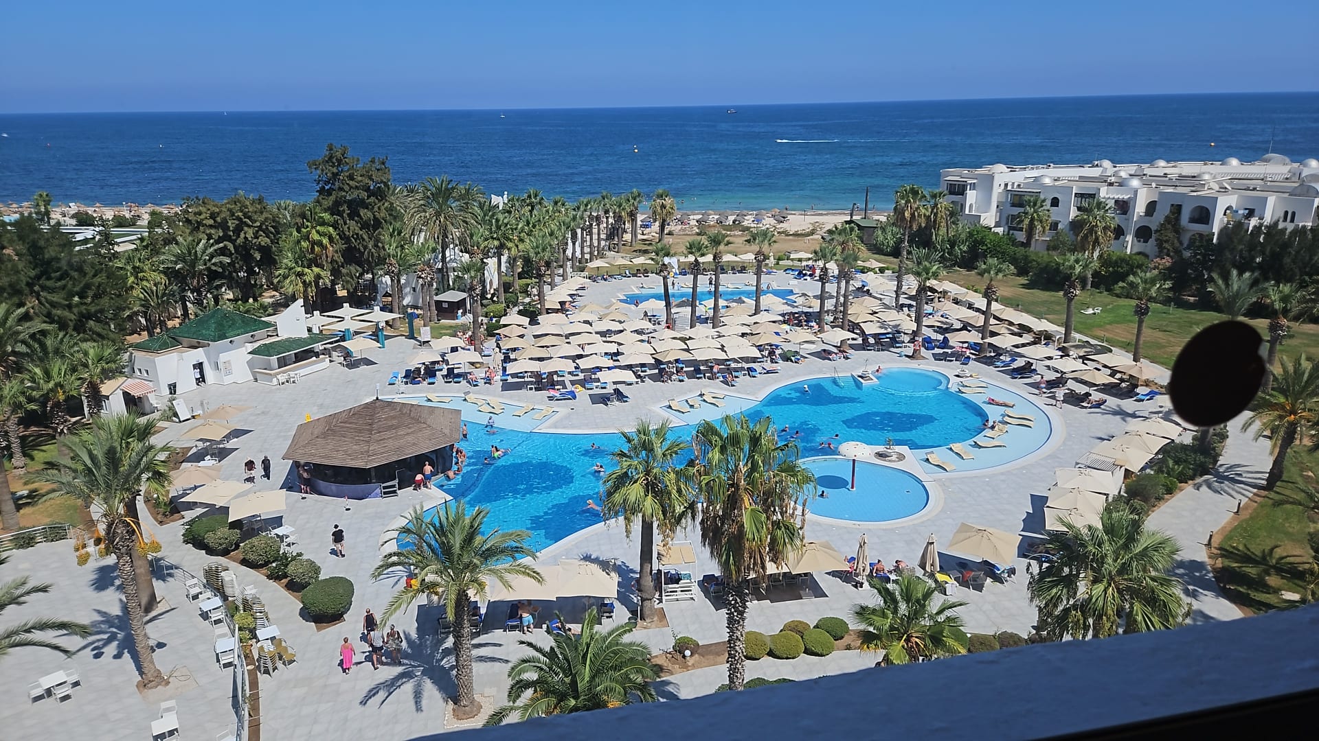 AußenansichtBlick vom Balkon auf die Anlage. Vorn der Meerwasser Pool, dann der Süßwasser Pool und das Meer