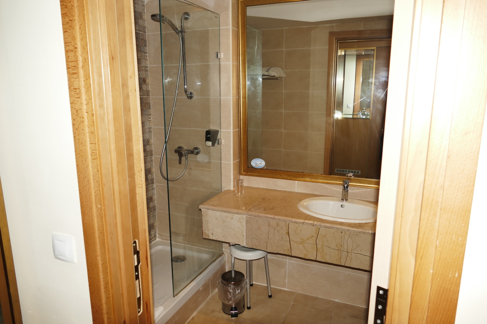 Badezimmer und Toilette sind getrennt voneinander. Hier ist das Badezimmer mit flacher Dusche, großem Ablagebereich, großem Spiegel, Fön und Waschbecken.