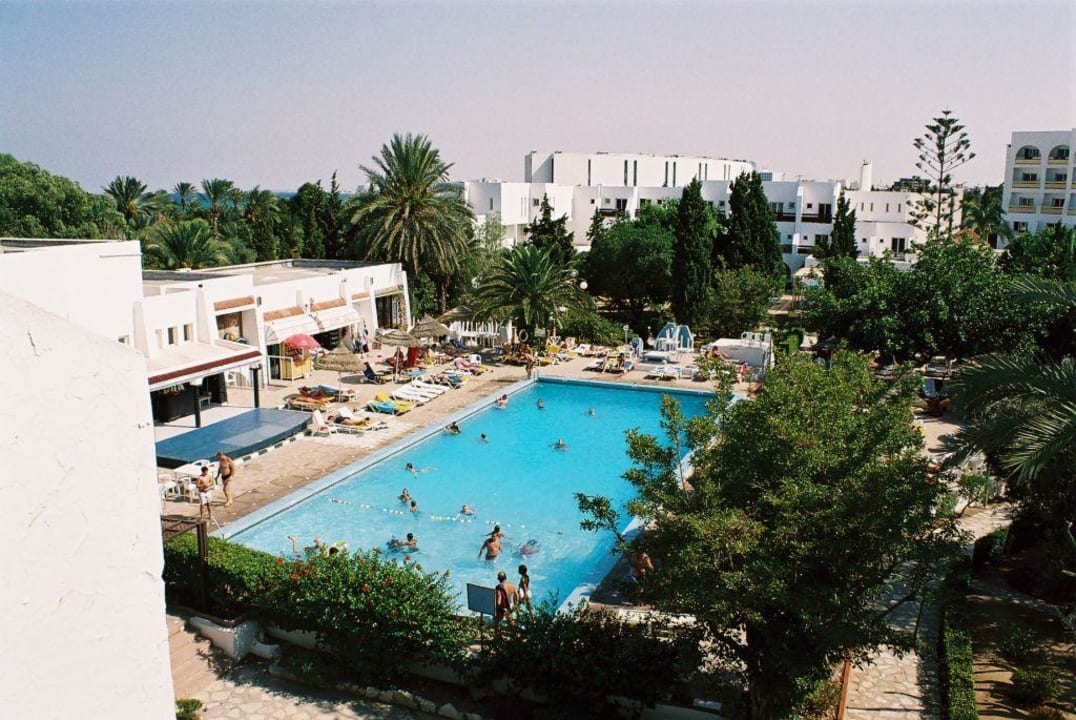 Poolblick aus Zimmer 401links neben dem Pool (weißes Gebäude) befindet sich die Poolbar, ein kleiner Shop,Minibühne für Animation