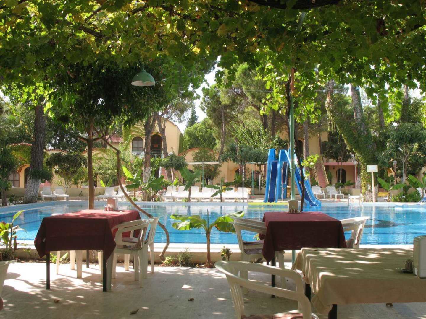 Tische und Stühle unter Weinreben am Pool