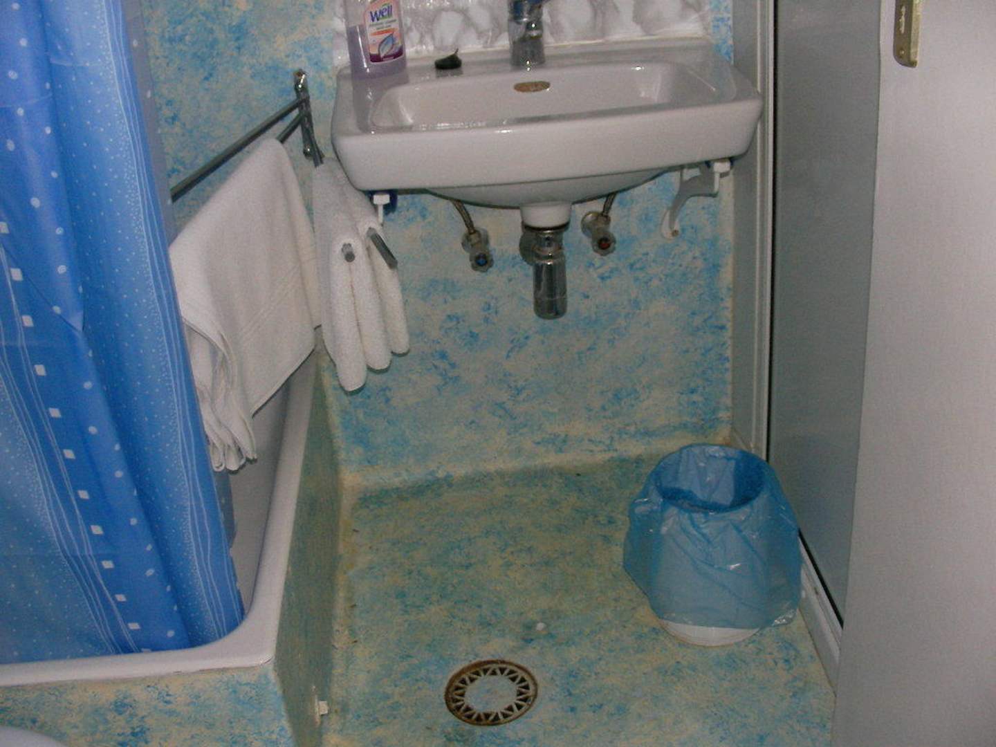 BadLinks die Toilette, daneben die Dusche welche nicht richtig abfloss. Ansonsten ein Allgemeinbild der sanitären Einrichtung
