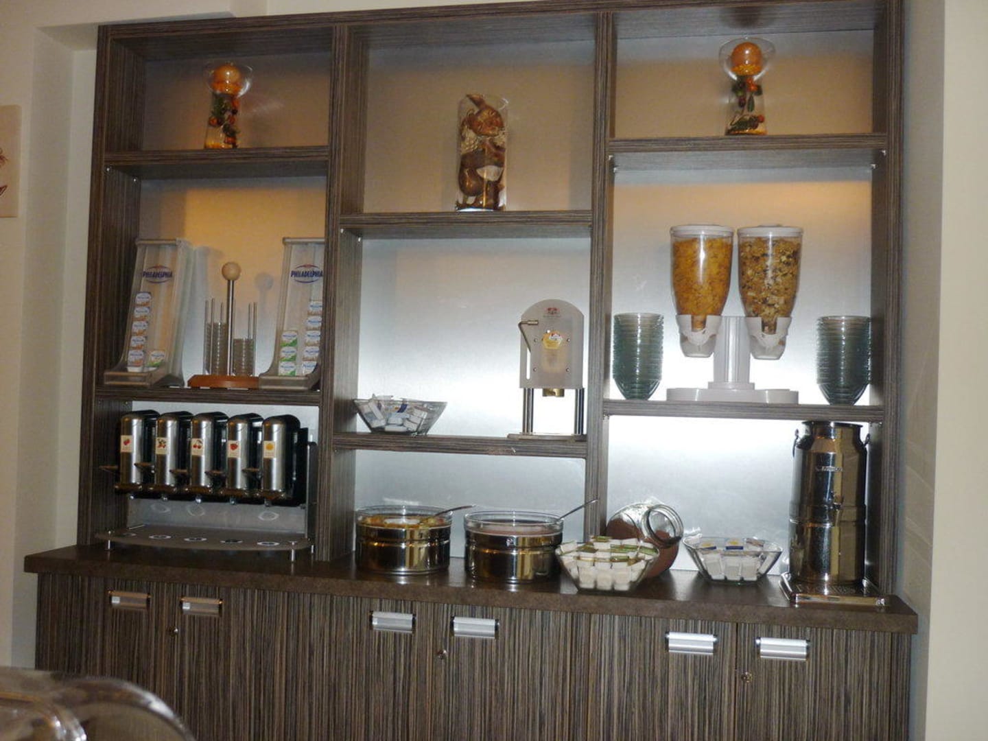 Müsli,versch. Marmeladen, Kakao & Milch, Frischkäse, Honig, Joghurt, Obstsalat