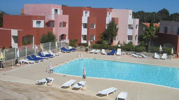 Blickvon der Terrasse auf Wohneinheiten und dem Pool