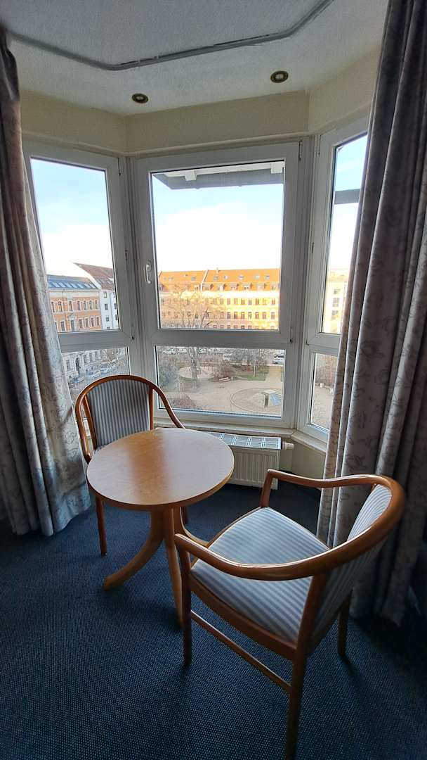 Erker mit Sitzecke Zimmer 365 - Blick auf den Körnerplatz.
