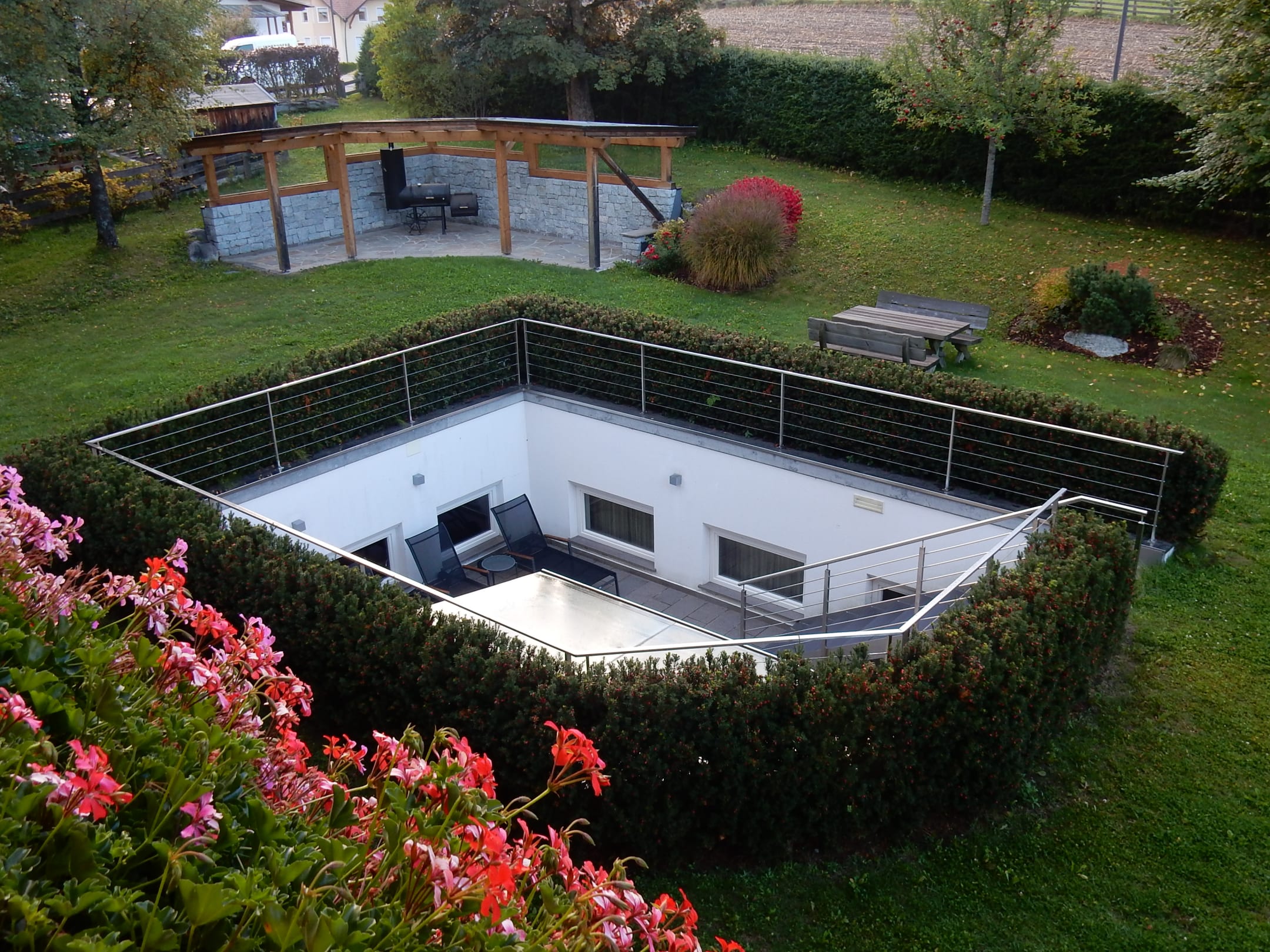 Ausblick vom Balkon auf den Freiluftbereich vom Wellnessbereich