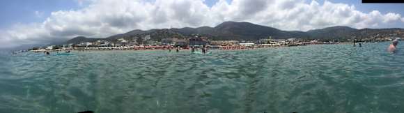Überfüllter Strand mit zahlreichen Liegebatterien