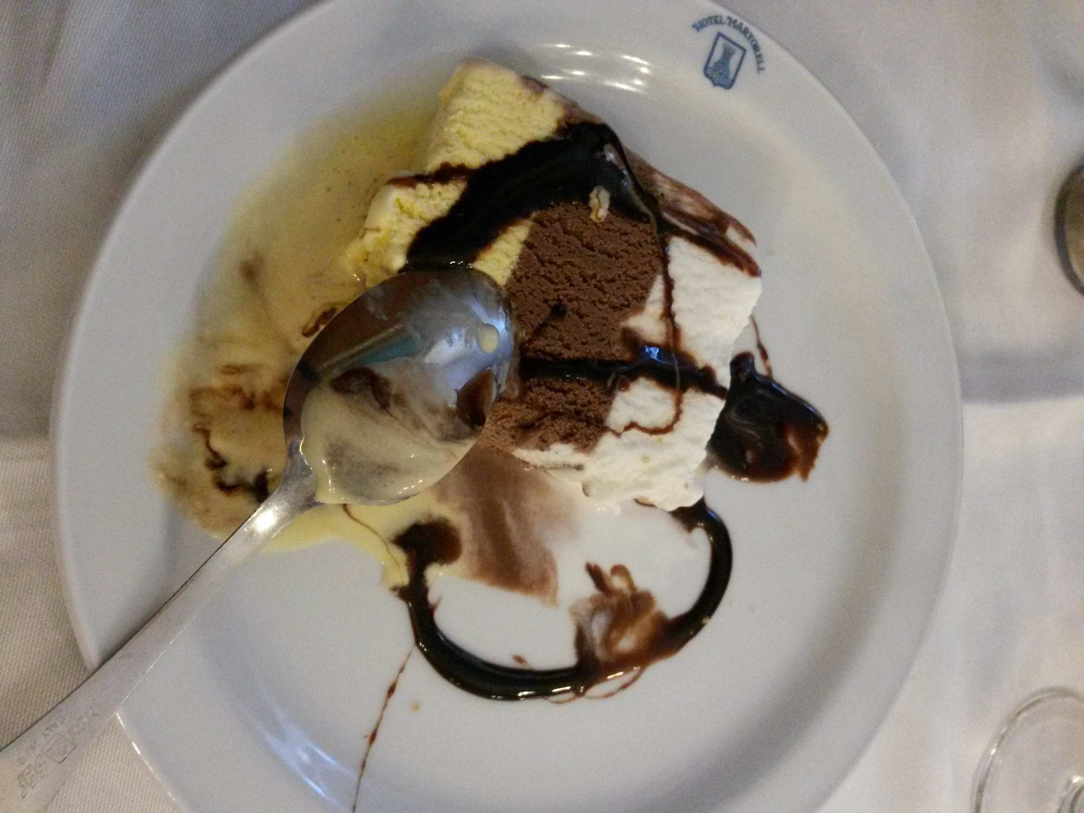 Eis aus der Packung mit Tubensoße.