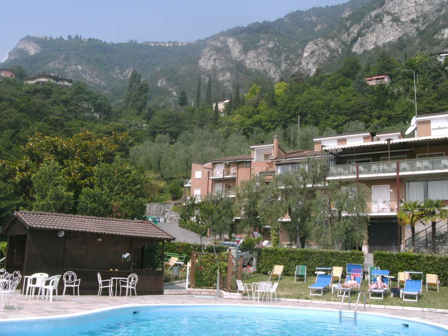 Aussicht vom Pool auf das Hotel und die Berge
