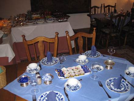 Ein sehr gemütlicher Früstücksraum, mit ansprechendem Geschirr und liebevoll angerichtetem Früstücksbuffet, es fehlt an nichts und es wird nachgefüllt.