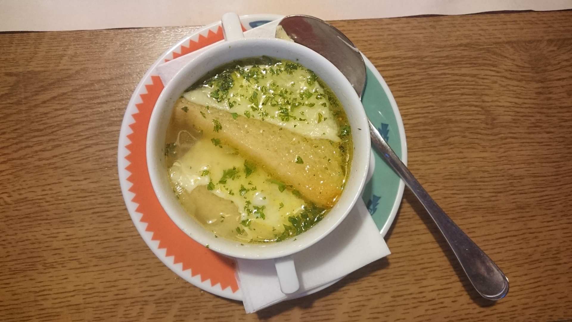 RestaurantDie "Französische Zwiebelsuppe" sollten Sie nur ordern, wenn Sie auf Tüten- oder Brühwürfelsuppe stehen. So schmeckt die Suppe leider.
